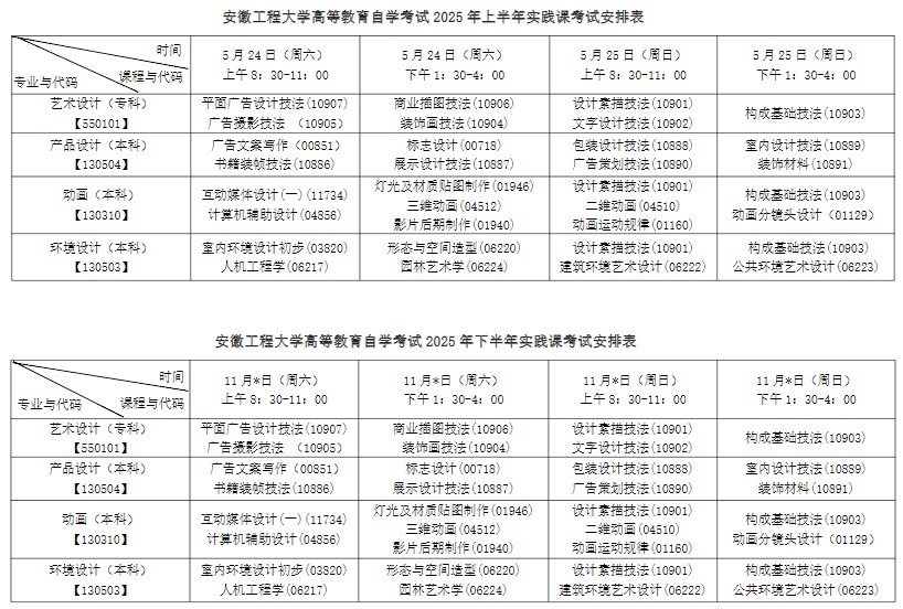 根據安徽工程大學高等教育自學考試開考專業(yè),結合教學實際,現將安徽工程大學高等教育自學考試2025年實踐課考試安排有關事項通知如下: