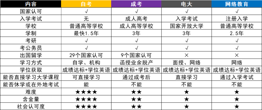 這四種學(xué)歷形式的區(qū)別主要體現(xiàn)在入學(xué)考試方式、學(xué)制、學(xué)習(xí)方式、難度和含金量等方面,具體可以用下面一張圖來表示: