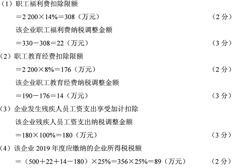 (2)全年發生合理的工資支出2200萬元,其中殘疾人員工資支出180萬元;發生職工福利費支出330萬元;發生職工教育經費支出190萬元。