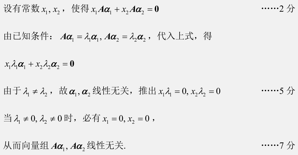 設A為n階矩陣,α1,α2分別是A的屬于特征值λ1,λ2的特征向量,且λ1≠λ2. 證明當λ1,λ2均不為零時,向量組Aα1,Aα2線性無關.