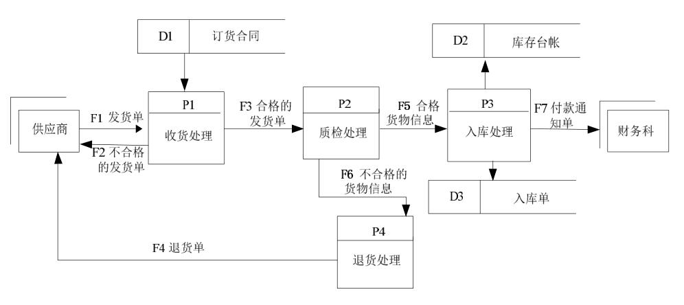 (1)供應商發出貨物,將發貨單提交給倉庫進行收貨處理,倉庫主管查詢訂貨合同,將不合格的發貨單退回給供應商,將合格的發貨單提交給庫管員;