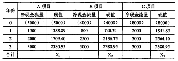 假設當前資本成本率為8%。乙企業現有A、B、C三個投資項目,其初始投資分別為5000萬元、4000萬元和8000萬元,三個項目各年的凈現金流量及現值的數據如下表所示(表內使用括號的數字為負數,單位:萬元)。