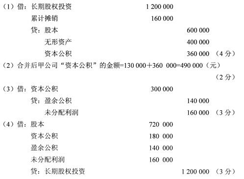 2020年10月自考試題:編制甲公司2019年1月1日合并乙公司的會計分錄