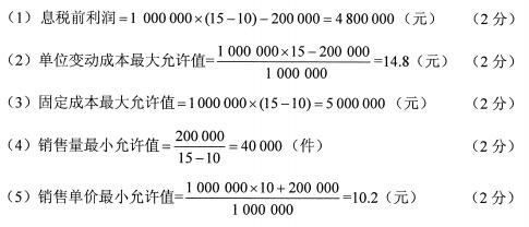 某企業只生產一種產品,該產品銷售單價為15元,單位變動成本為10元,年固定成本總額為200 000元,計劃年銷售量為100 0000件。公司財務部門正在進行該產品的利潤敏感性分析,測算影響利潤各因素的臨界值。