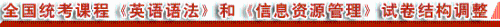 為進(jìn)一步實(shí)現(xiàn)全國統(tǒng)考課程《英語語法》(課程代碼:0831)和《信息資源管理》(課程代碼:2378)的考核目標(biāo),自2009年7月考試起,全國高等教育自學(xué)考試指導(dǎo)委員會(huì)上海命題中心將對(duì)《英語語法》和《信息資源管理》兩門課程試卷結(jié)構(gòu)進(jìn)行部分調(diào)整。[全文]