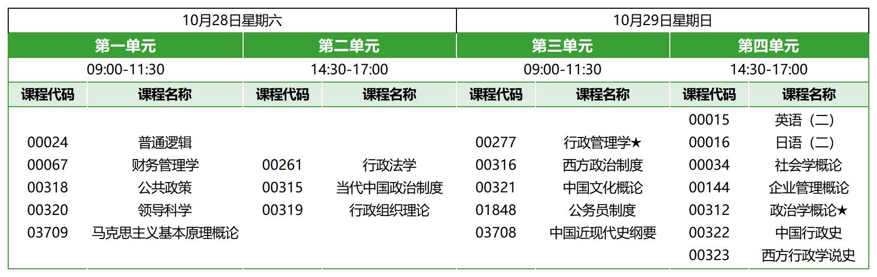 北京自考本科行政管理學專業(yè),專業(yè)代碼01B0302,2023年10月自考考試時間為10月28日-29日,上午9:00-11:30,下午14:30-17:00,本次考期共開考20門科目,具體科目安排如下:
