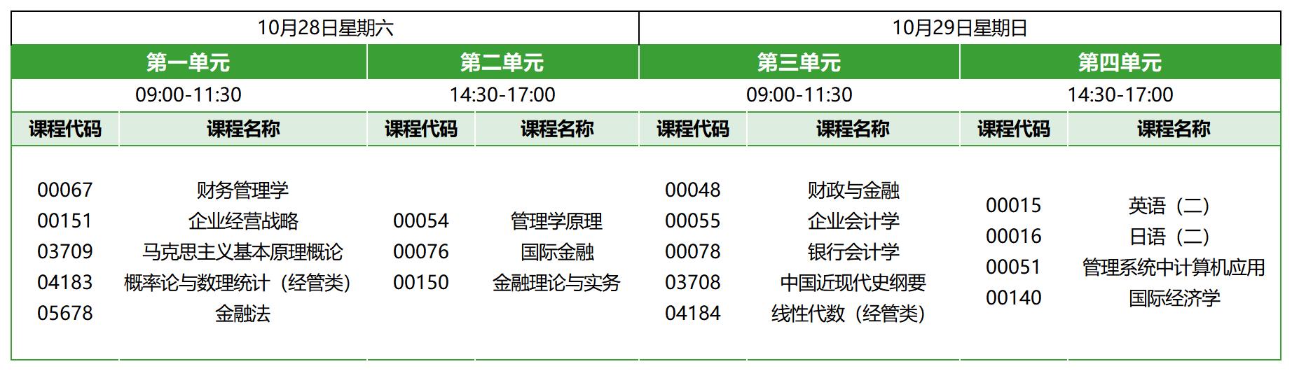 北京自考本科金融管理專業(yè),專業(yè)代碼01C1203,2023年10月自考考試時(shí)間為10月28日-29日,上午9:00-11:30,下午14:30-17:00,本次考期共開(kāi)考17門(mén)科目,具體科目安排如下: