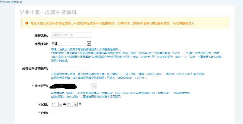 2. 論文申報(bào)時(shí),對(duì)申報(bào)系統(tǒng)未能提取到成績(jī)的課程,考生要根據(jù)自己手中的成績(jī)單,如實(shí)補(bǔ)錄成績(jī)和考試時(shí)間。補(bǔ)錄課程后,還要按照《北京市高等教育自學(xué)考試本科畢業(yè)論文申報(bào)憑單》提示要求,在論文申報(bào)期間上傳待審核材料。