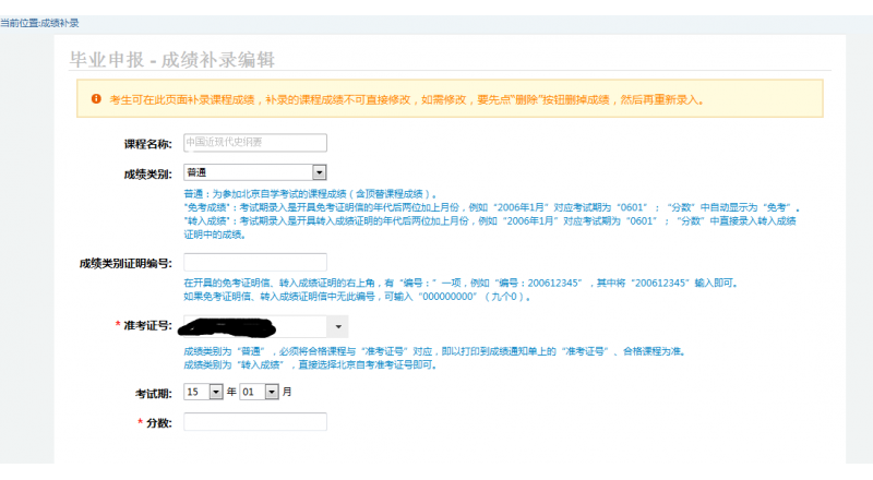 2. “成績類別證明編號”。如果補(bǔ)錄的是“免考成績”或者“轉(zhuǎn)入成績”還需將成績單上的成績證明編號填寫到相應(yīng)文本框中,如果是“考試成績”則不必填寫此項(xiàng)。