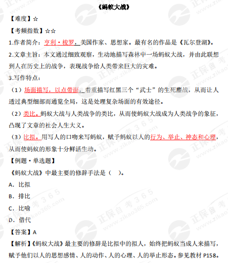 2023年10月自學考試備考正在進行中,自考365網(wǎng)校為各位考生整理了2023年10月自考公共課《大學語文》記敘性散文部分的高頻考點——《螞蟻大戰(zhàn)》,正在復(fù)習的同學快來查收!