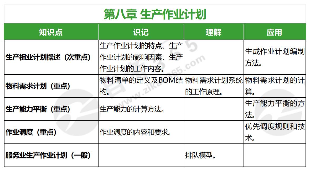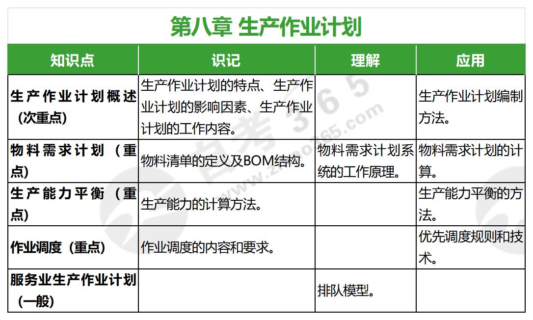 2019年版企業(yè)運營管理的第八章生產(chǎn)作業(yè)計劃中,共有五個考核知識點,其中考核的重點為物料需求計劃、生產(chǎn)能力平衡、作業(yè)調(diào)度,次重點為生產(chǎn)作業(yè)計劃概述,具體考核的關(guān)鍵知識點及其考核要求如下:
