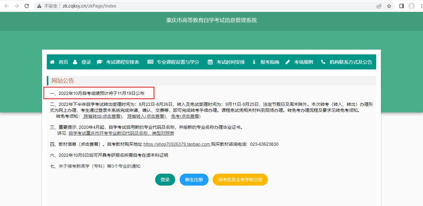 根據(jù)重慶市高等教育自學(xué)考試信息管理系統(tǒng)的公告,2022年10月重慶自考成績(jī)已于11月19日公布。