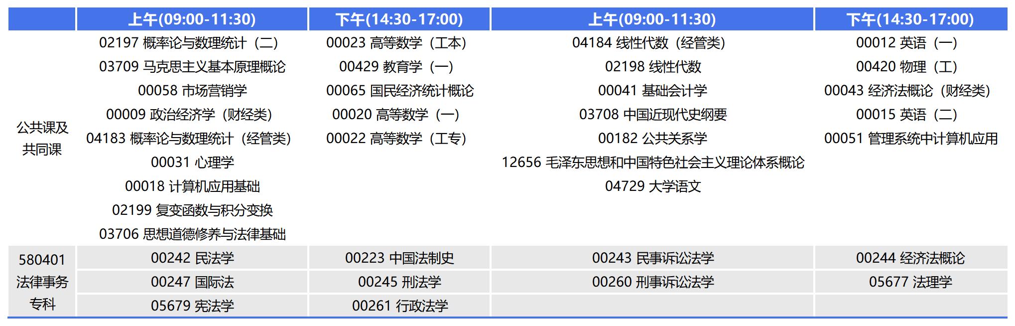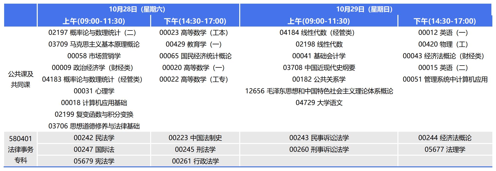 10月28日-29日開考的2023年10月重慶自考??品墒聞諏I(yè),專業(yè)代碼:580401(原專業(yè)代碼:680503),每天有兩場考試,分別在上午9點-11點半,下午2點半-5點,每場考試時長150分鐘。