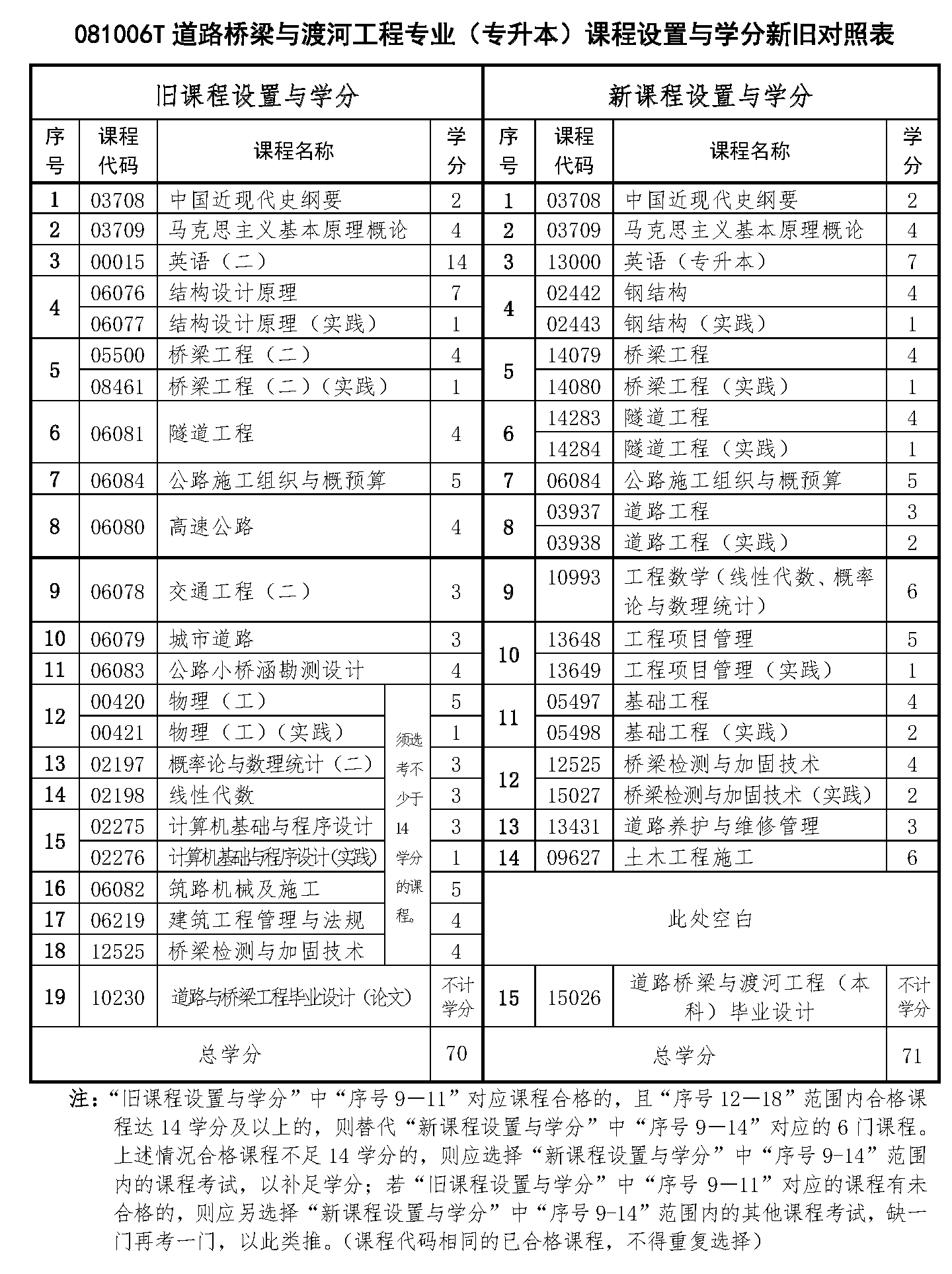 重慶自考本科道路橋梁與渡河工程新舊專業(yè)課程對照表(2024年版專業(yè)計劃)