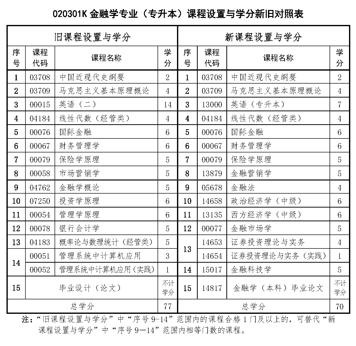 自2026年開始,重慶自考將啟用2024年版專業(yè)計劃,其中,重慶自考本科金融學(xué)專業(yè)的課程設(shè)置與學(xué)分新舊對照表如下: