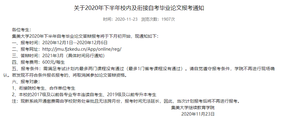 以集美大學(xué)為例,在發(fā)布的2020年下半年校內(nèi)及銜接自考畢業(yè)論文報(bào)考通知中,對(duì)于本校主考專業(yè)的畢業(yè)論文報(bào)名時(shí)間、報(bào)名要求及費(fèi)用等信息進(jìn)行了說明。