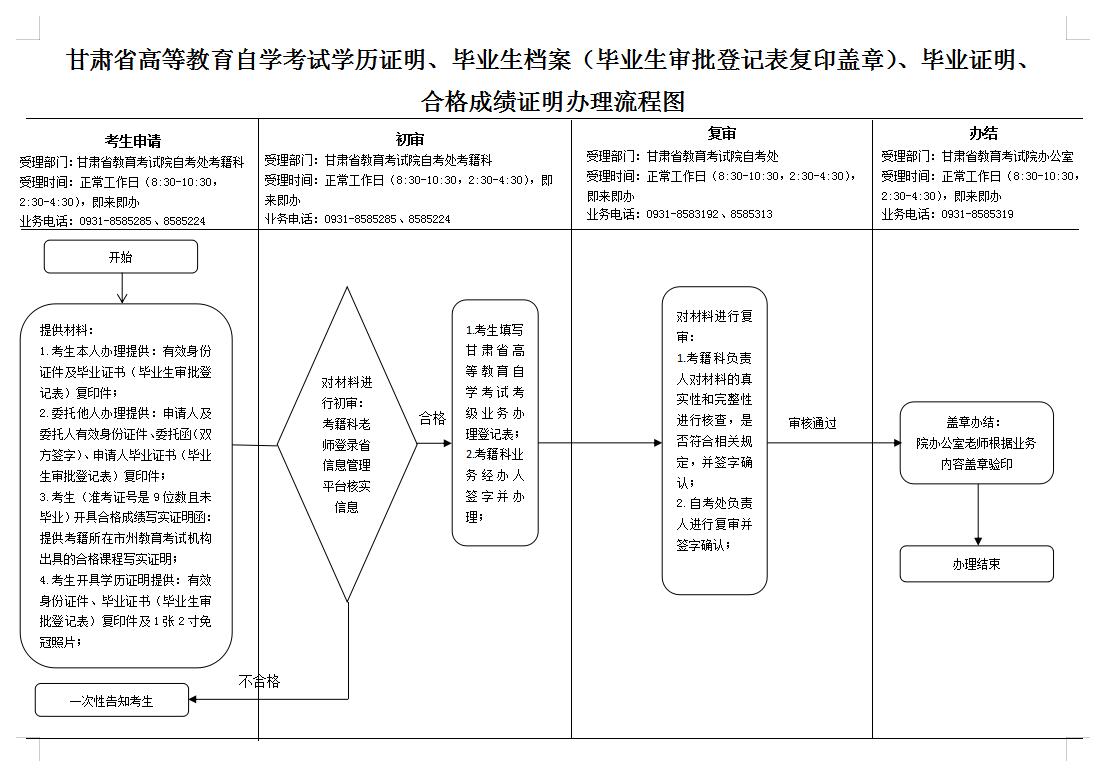 甘肅省高等教育自學(xué)考試學(xué)歷證明、畢業(yè)生檔案(畢業(yè)生審批登記表復(fù)印蓋章)、畢業(yè)證明、合格成績(jī)證明辦理流程圖如下,可點(diǎn)擊圖片查看大圖: