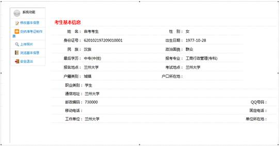 考生可用所填寫的身份證號碼登錄系統(tǒng)(密碼始終為身份證號)。登錄成功后,顯示考生已填寫的報名信息,如下圖頁面:
