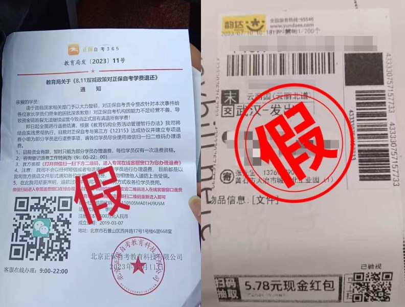 近期發(fā)現(xiàn),電信網(wǎng)絡(luò)詐騙手段變換升級:通過快遞方式郵寄詐騙宣傳單進行詐騙。其內(nèi)容多以“XXX培訓機構(gòu)退費公告”為標題,稱機構(gòu)面臨國家相關(guān)部門整頓、資金鏈斷裂等原因給部分學員辦理退費,并附上二維碼或QQ號,通過掃二維碼、加QQ、下載軟件或APP等手段對學員實施詐騙,該行為涉嫌違法犯罪!望各位學員務(wù)必提高警惕,謹防被騙!如發(fā)現(xiàn)受騙,請及時保留證據(jù),向公安機關(guān)報案。