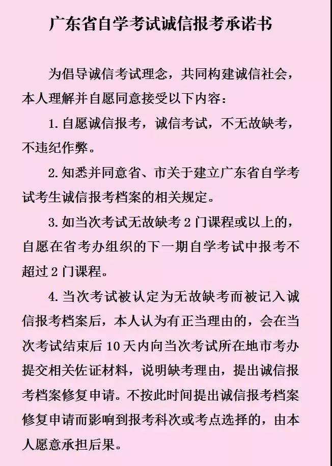 考生進(jìn)入自學(xué)考試管理系統(tǒng)報(bào)考頁(yè)面,須認(rèn)真、完整閱讀并同意本須知的全部?jī)?nèi)容(含《廣東省自學(xué)考試誠(chéng)信報(bào)考承諾書》,見文后)后方能報(bào)考。在開展建立自學(xué)考試誠(chéng)信報(bào)考檔案試點(diǎn)的地市,考生違背《廣東省自學(xué)考試誠(chéng)信報(bào)考承諾書》,當(dāng)期考試缺考2門課程或以上,將被認(rèn)定為無(wú)故缺考,并記入考生誠(chéng)信報(bào)考檔案;在省考辦組織的下一期自學(xué)考試中,在建立誠(chéng)信報(bào)考檔案試點(diǎn)的地市只能報(bào)考不超過(guò)2門課程,非試點(diǎn)地市仍可自由報(bào)考??忌鷳?yīng)根據(jù)自身實(shí)際情況合理報(bào)考,誠(chéng)信應(yīng)考。