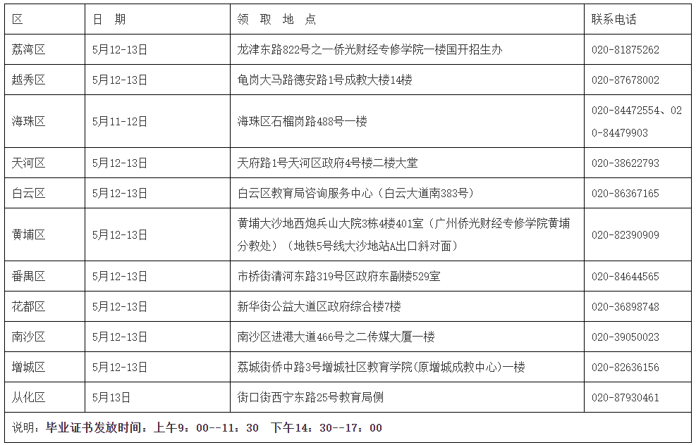 經廣東省自學考試委員會審核,我市2019年下半年自學考試畢業證書辦理工作已完成。請考生本人在規定的時間憑準考證、身份證和畢業登記回執,到辦理畢業登記申請和初審的區招考辦指定地點領取畢業證書(或審核未通過的退檔材料)。具體時間安排如下: