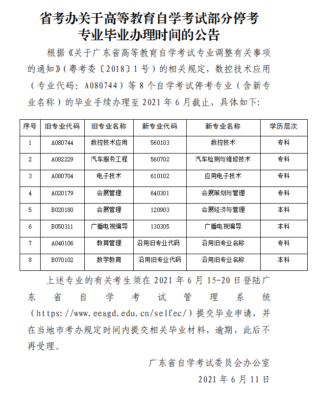 廣東自考數(shù)控技術(shù)應(yīng)用等部分停考專(zhuān)業(yè)畢業(yè)辦理時(shí)間的公告