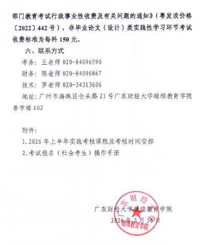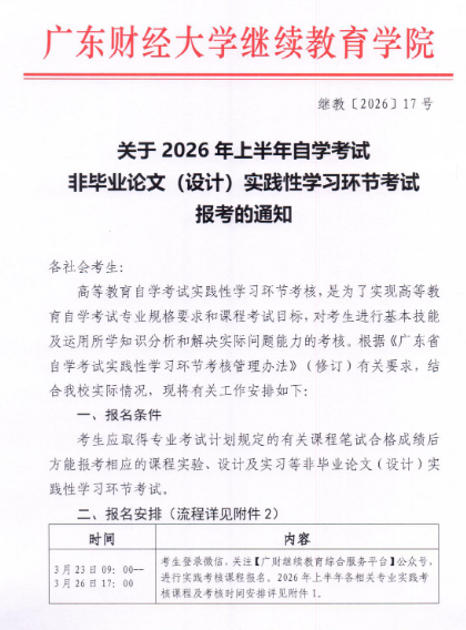 廣東財(cái)經(jīng)大學(xué)關(guān)于2026年上半年自學(xué)考試非畢業(yè)論文實(shí)踐性學(xué)習(xí)環(huán)節(jié)考試報(bào)考的通知