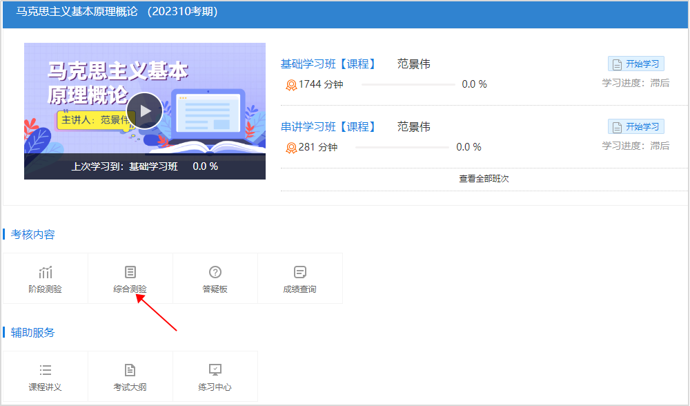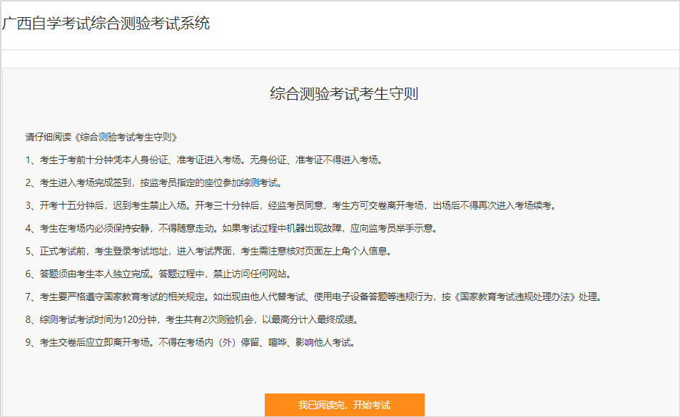 3、考試時,考期選擇202310考期,輸入考生本人的學習賬號和密碼,登錄綜合測驗考試系統(tǒng),考生確認已閱讀《綜合測驗考生守則》后,點擊“我已閱讀完,開始考試”。如果登錄存在問題,請撥打電話客服電話重置密碼。