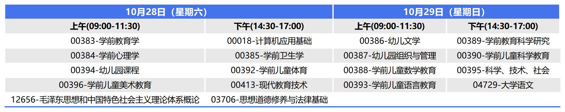 2023年10月考期廣西自考專科學前教育專業(yè),專業(yè)代碼670102K,將于10月28日-29日開考,每天有兩場考試安排,上午9:00-11:30和下午14:30-17:00,考試時長150分鐘。