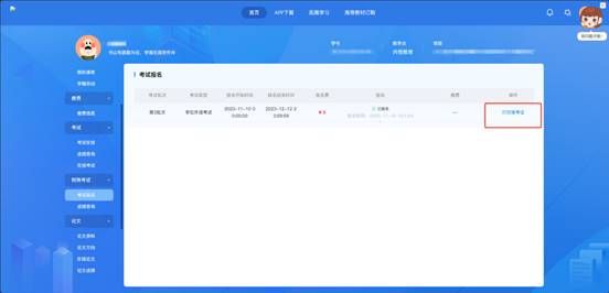 點擊【打印準考證】,務必在打印準考證的規(guī)定時間內(nèi)進行準考證打印工作。