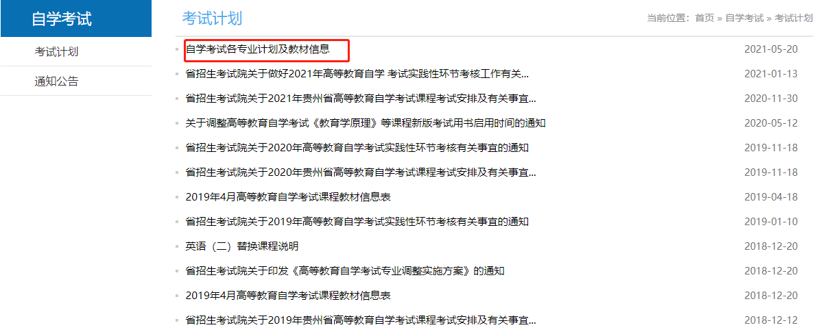 由于貴州自考專業(yè)計(jì)劃所包含的科目不同,所以考試需要的教材也不同??忌傻卿涃F州省招生考試院-自學(xué)考試欄目查詢報(bào)考專業(yè)的專業(yè)計(jì)劃及課程教材(如下圖所示),或者直接點(diǎn)擊→2021年貴州省自學(xué)考試各專業(yè)計(jì)劃及教材信息,找到所報(bào)考專業(yè)的專業(yè)計(jì)劃,通過(guò)課程代碼或名字搜索相應(yīng)的教材版本。
