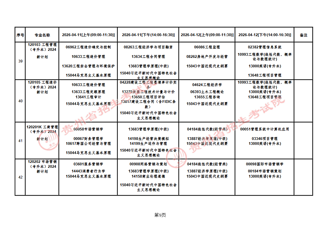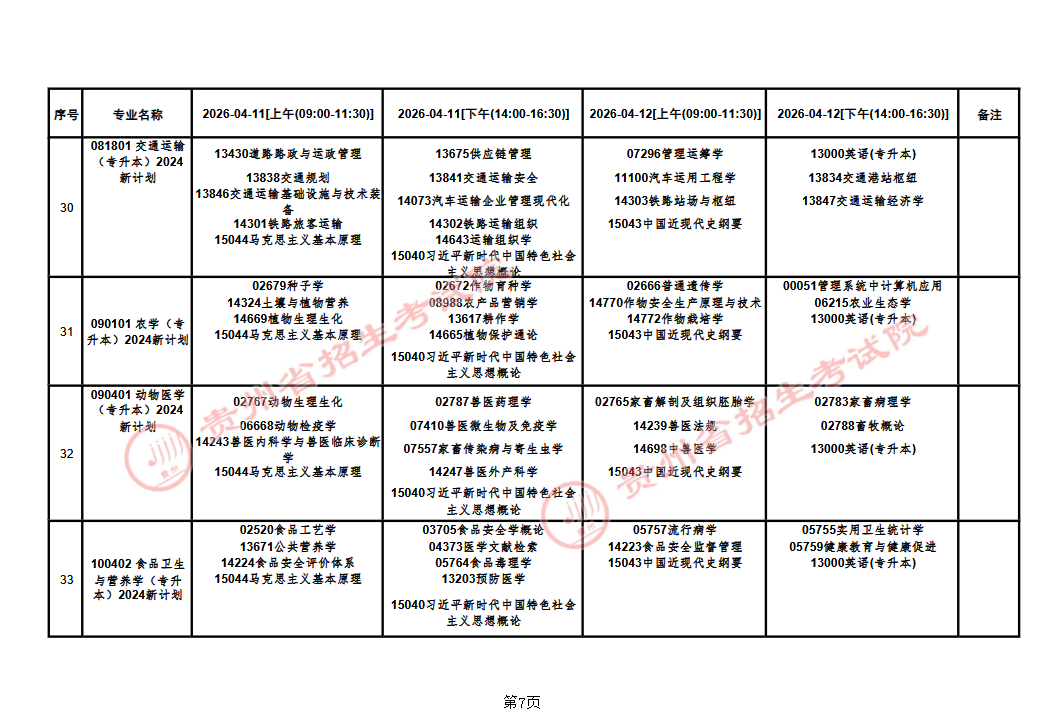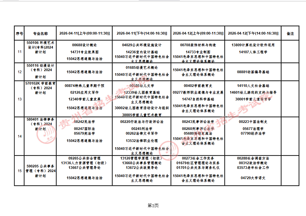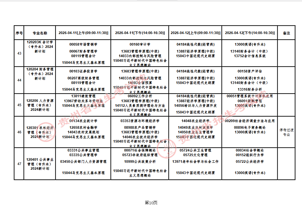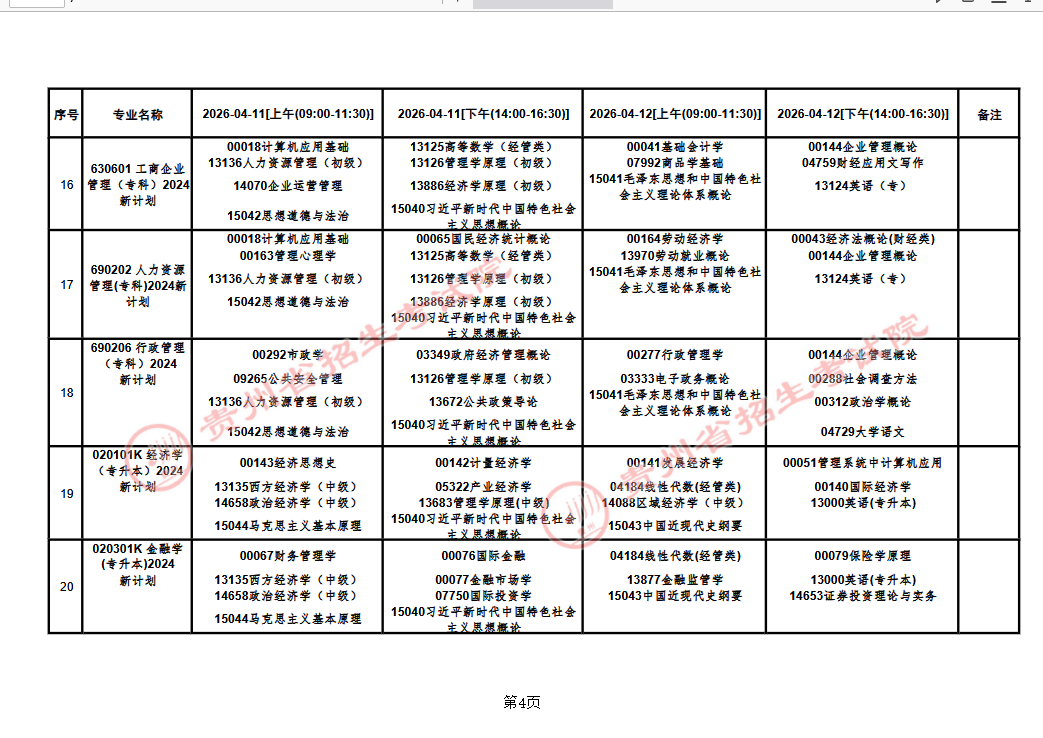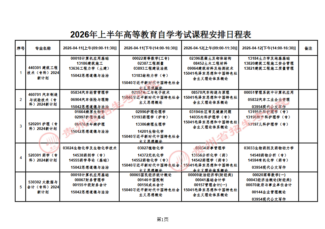 貴州省2026年上半年高等教育自學考試課程考試安排表