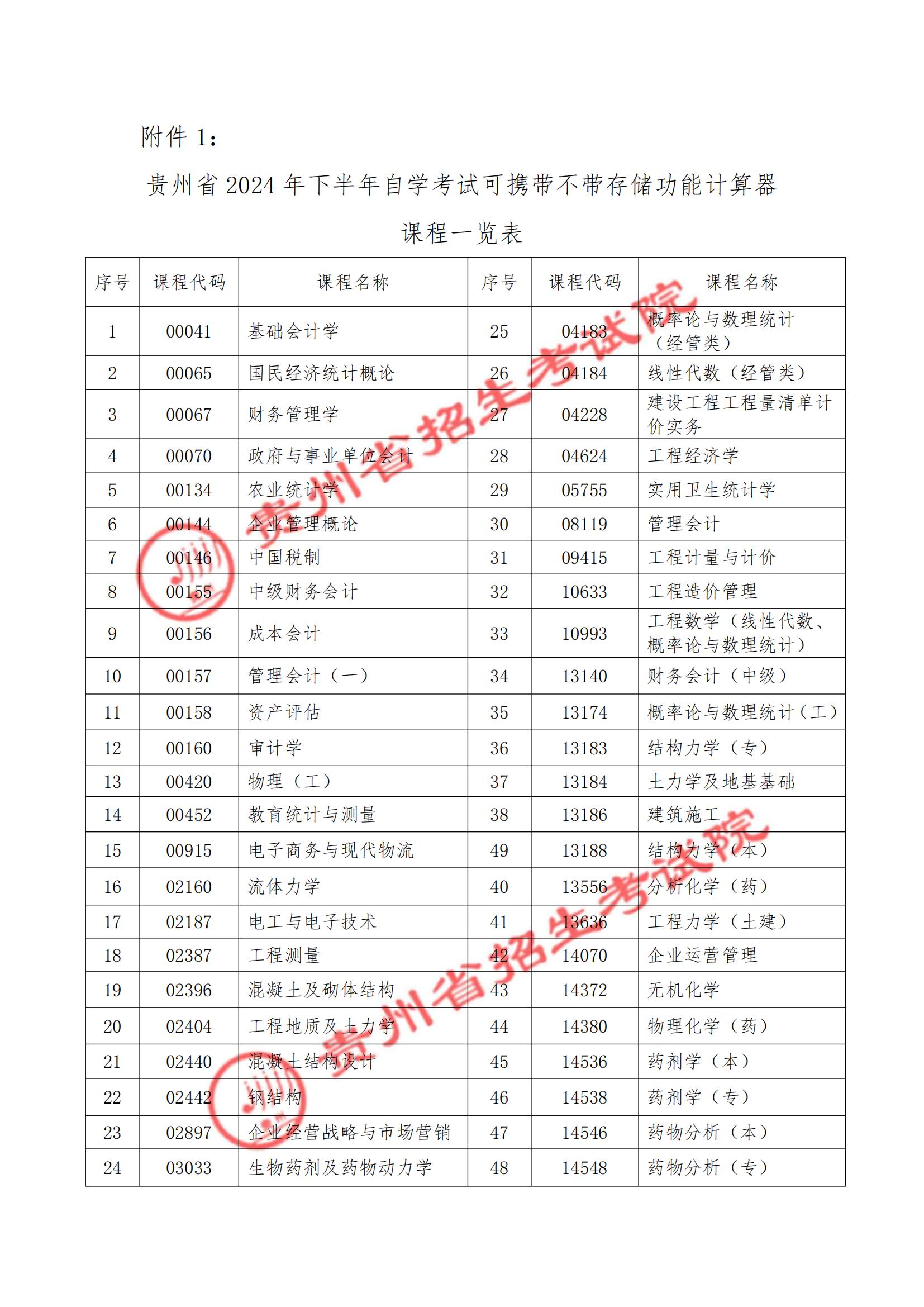 詳情請查看附件1:《貴州省2024年下半年自學考試可攜帶不帶存儲功能計算器課程一覽表》。