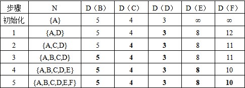 所以節(jié)點(diǎn)A到各節(jié)點(diǎn)最短路由:A-B(5);A-C(4);A-D(3);A-D-E(8);A-D-E-F(10)。