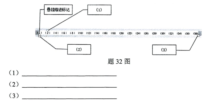 在Word 2016的水平標(biāo)尺中有多個(gè)滑塊,寫出如題32圖所示標(biāo)識(shí)號(hào)指向的滑塊名稱。