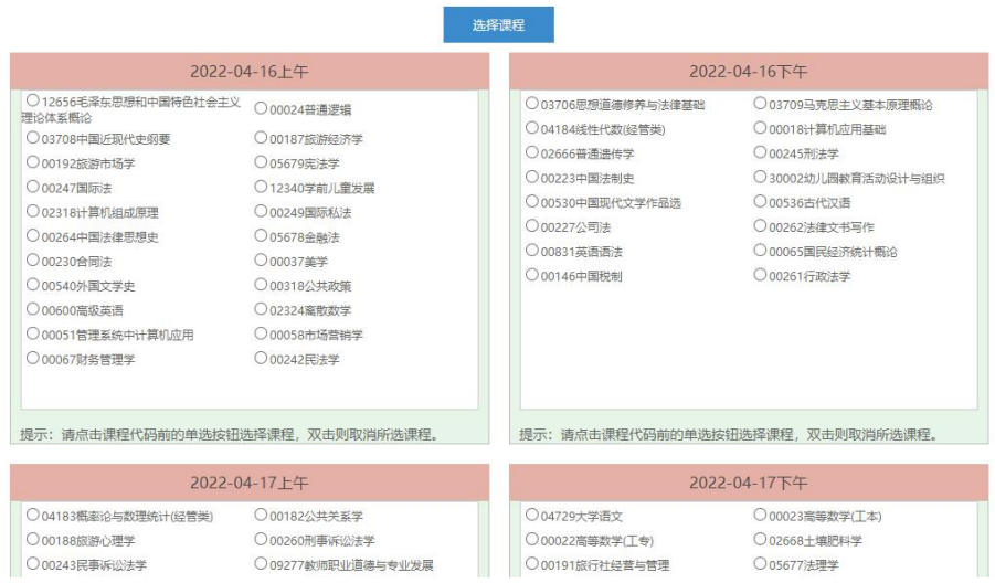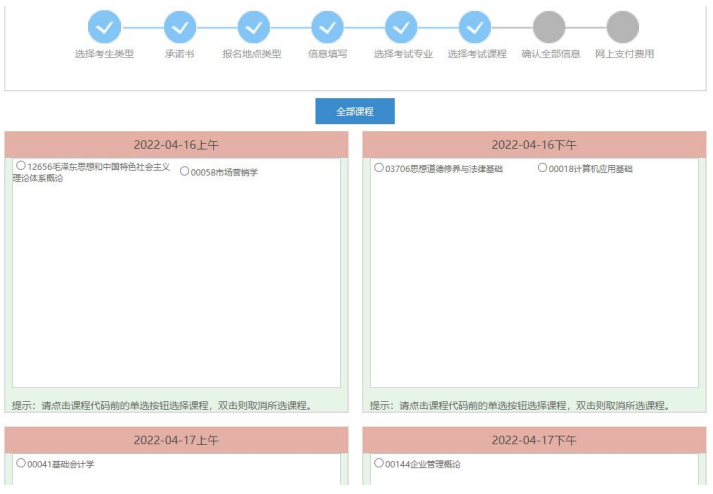6、選擇專業(yè)后,顯示【選擇課程】顯示的是本專業(yè)下的可報(bào)考的課程,點(diǎn)擊【全部課程】按鈕后切換顯示所有可報(bào)考的課程,選擇報(bào)考課程后進(jìn)行下一步