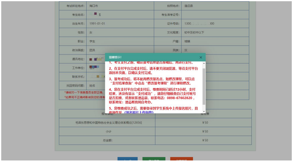 7、確認(rèn)個(gè)人信息及報(bào)考信息,閱讀溫馨提示信息,信息確認(rèn)無誤后,點(diǎn)擊【確認(rèn)信息】按鈕后,信息不可修改,進(jìn)行下一步,網(wǎng)上支付