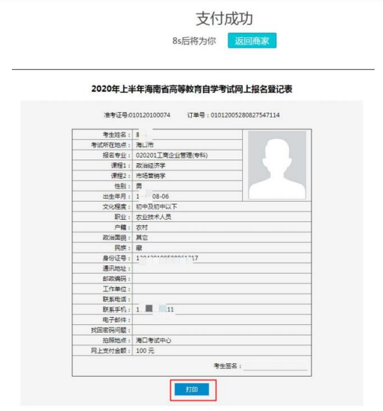 選擇微信/支付寶/云閃付掃碼進(jìn)行支付,成功后點(diǎn)擊返回商家或等待10 秒進(jìn)入網(wǎng)上報(bào)名登記表打印頁(yè)面,點(diǎn)擊打印