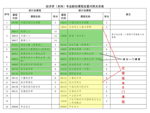 舉例:經(jīng)濟學(xué)(本科)專業(yè)某考生,已通過原計劃8門課程,可對應(yīng)頂替新計劃8門課程,如下圖綠色部分所示。該生還需要通過新計劃中剩余的8門課程(含畢業(yè)論文),如下圖黃色部分所示,即可達到新計劃畢業(yè)條件。