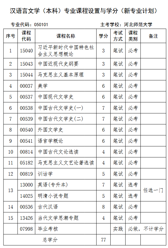 2026年河北自考本科漢語言文學專業(yè)計劃