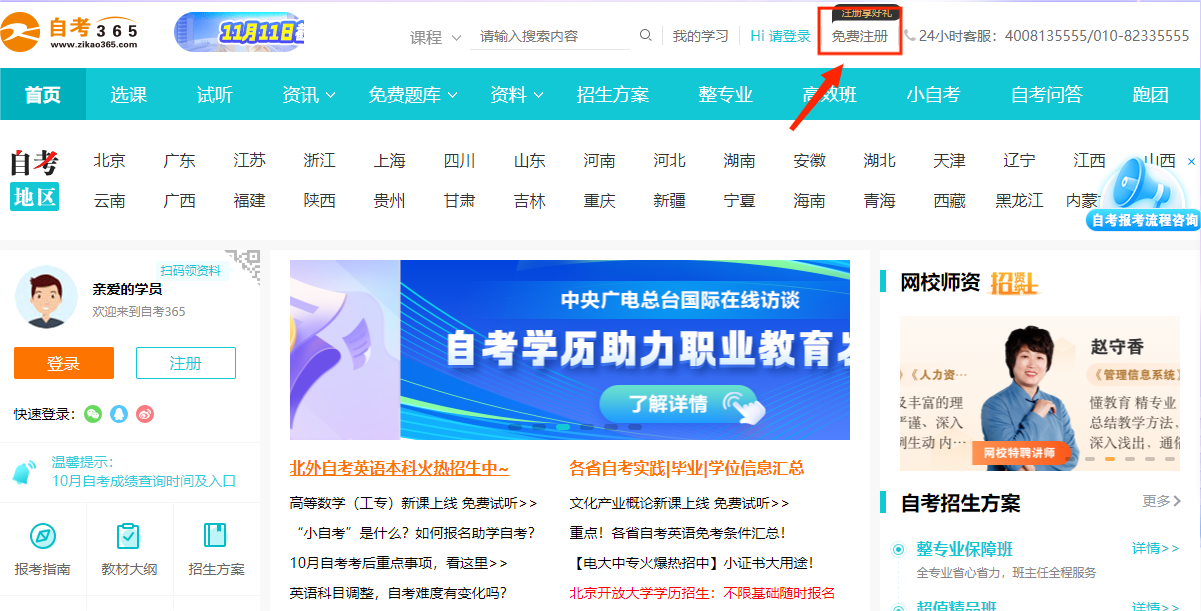 1進(jìn)入自考365網(wǎng)校網(wǎng)站首頁,在左上部點(diǎn)擊注冊按鈕,進(jìn)入注冊頁面。