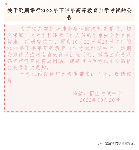 [河南]關(guān)于延期舉行2022年下半年鶴壁市自學(xué)考試的公告