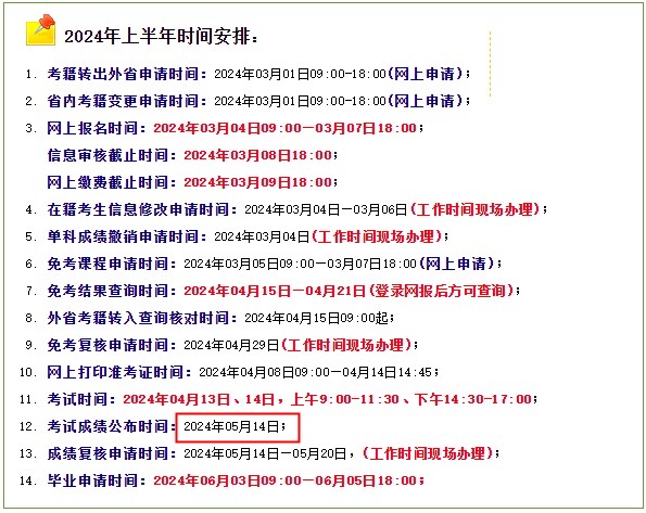河南自考考試之后,接下來的重點(diǎn)便是密切關(guān)注河南自考成績的查詢時間,目前,河南省高等教育自學(xué)考試考生服務(wù)平臺顯示的2024年上半年時間安排中可以看到, 2024年4月河南自考成績將在5月14日公布。