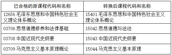 考生已取得合格的原思想政治理論課程,將按照以下對(duì)應(yīng)關(guān)系自動(dòng)進(jìn)行轉(zhuǎn)換。