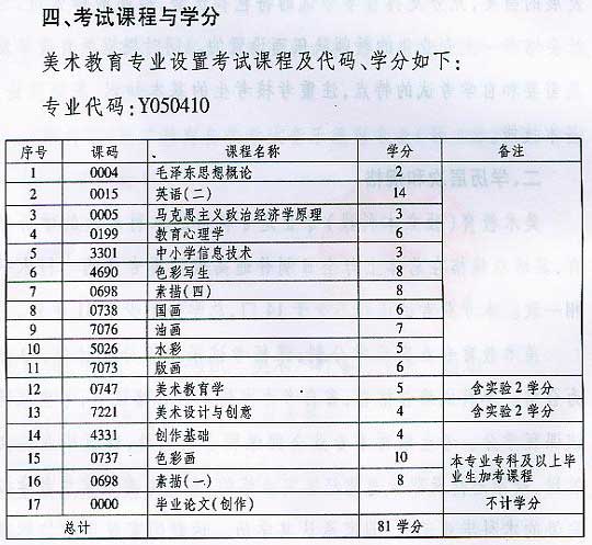 美術(shù)教育(獨(dú)立本科段)專業(yè)是專科后的本科層次的學(xué)歷教育,其培養(yǎng)規(guī)格在總體上與全日制普通高校同類專業(yè)的本科水平相一致。本專業(yè)考試課程不少于14門(mén),總學(xué)分不少于81學(xué)分。