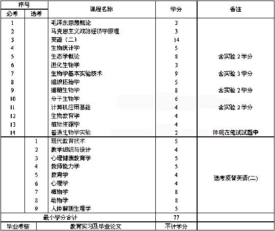 4、 師范教育類非生物教育專業(yè)的專科畢業(yè)生報(bào)考本專業(yè)時(shí)應(yīng)加考:動(dòng)物學(xué)(8學(xué)分);植物學(xué)(8學(xué)分)、人體解剖生理學(xué)(5學(xué)分);