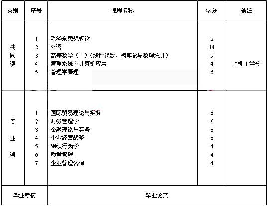 4、 其他專業(yè)的專科畢業(yè)生報(bào)考本專業(yè),須加考(已通過的課程可免考):政治經(jīng)濟(jì)學(xué)(財(cái)經(jīng)類)(6學(xué)分)、企業(yè)管理概論(5學(xué)分)、生產(chǎn)與作業(yè)管理(6學(xué)分)、市場營銷學(xué)(5學(xué)分)、企業(yè)會計(jì)學(xué)(6學(xué)分);
