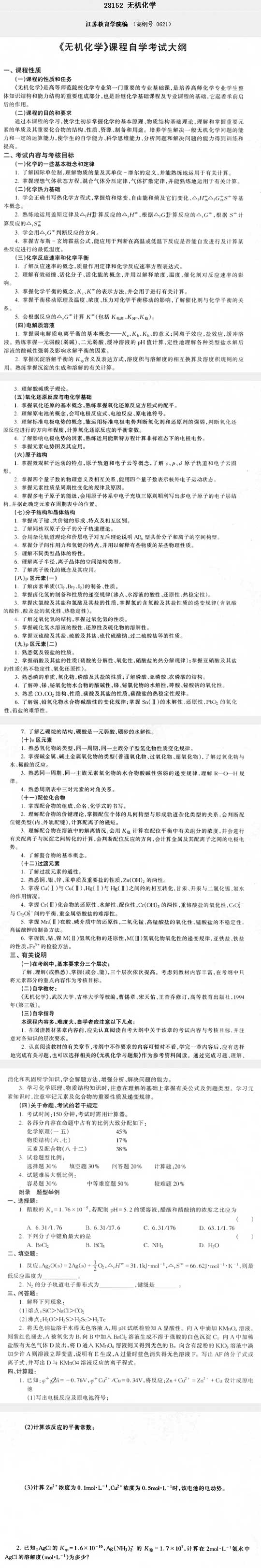 江蘇自學考試無機化學教材大綱