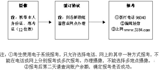 1、已攝像的舊生請(qǐng)于2007年11月10日—11月20日可通過電話96040、或編輯短信(具體請(qǐng)看5184網(wǎng)站上的介紹)或上網(wǎng)報(bào)考科目。(南海區(qū)考試地點(diǎn)代碼0682)