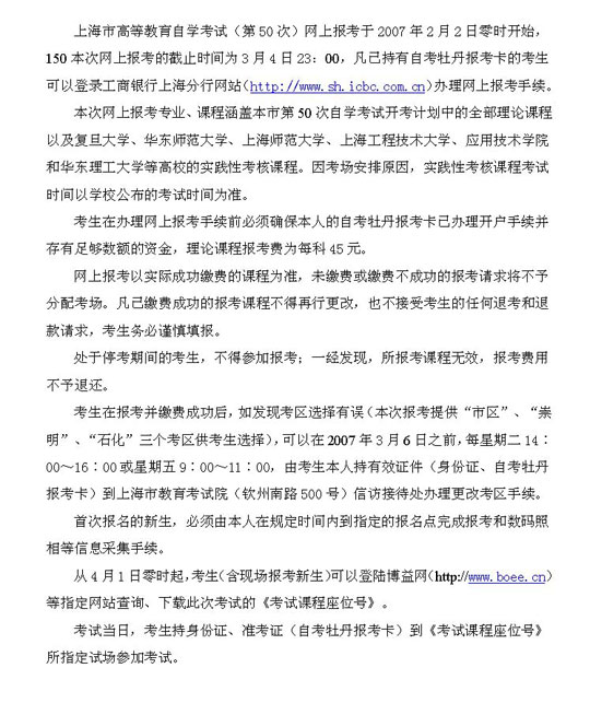 上海市自學(xué)考試07年上半年(第50次)網(wǎng)報須知